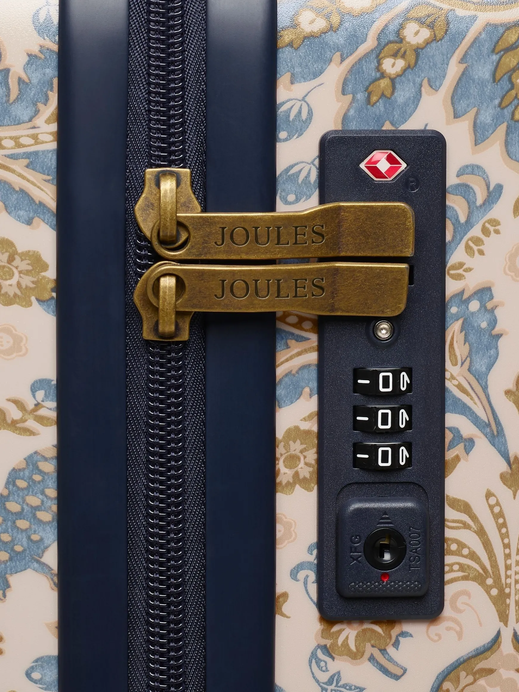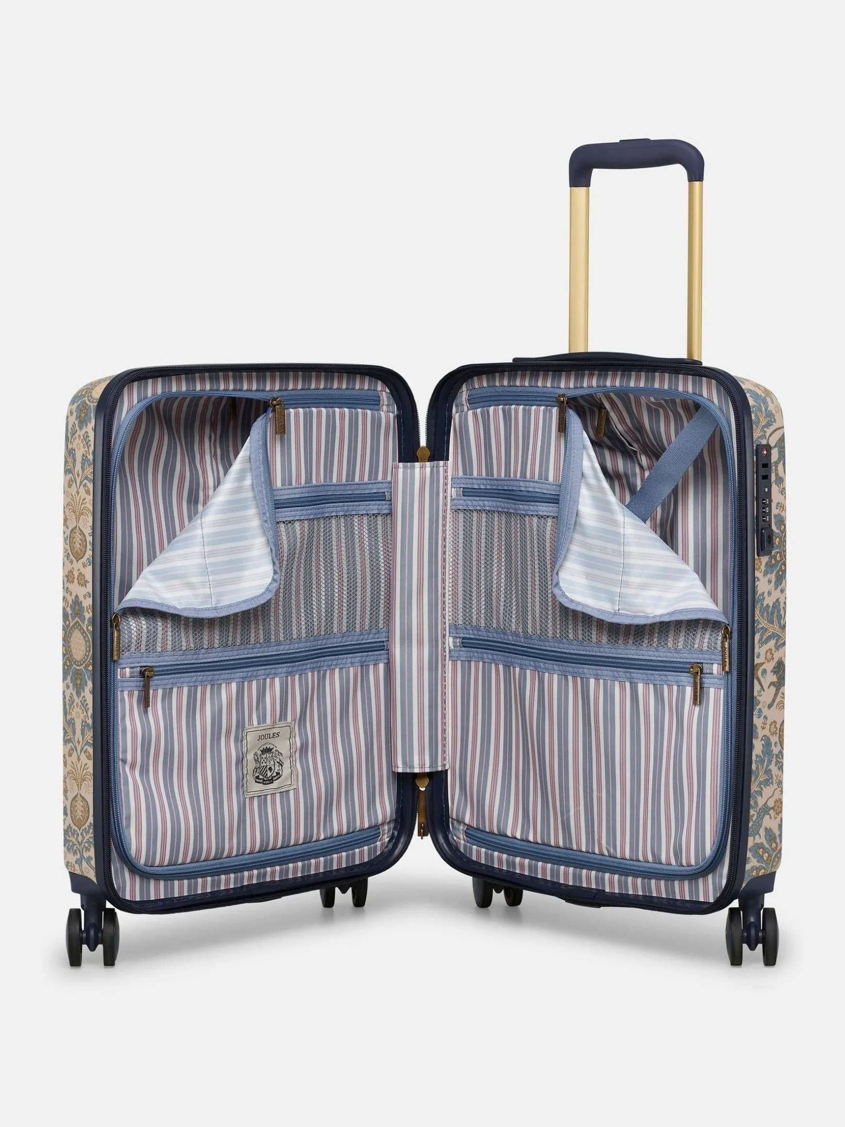 Travel in style with the Joules large-sized suitcase – perfect for long-haul trips to far-flung destinations, or for combining the whole family’s holiday outfits into one case. Its hard shell outer is lightweight, durable and adorned with an elegant damask print which has been hand-drawn by the Joules print team for a truly distinctive look. Its four spinner-wheel design ensures 360° movement and the telescopic trolley handle further enhances its ease of use. To give you full peace of mind when travelling overseas, the TSA-approved lock will ensure all your belongings remain safe. Inside is a haven if your style of packing is of the organised kind. It features two main zipped compartments, one of which has a compression strap for keeping things in place, as well as four additional zipped pockets for smaller items. It’s finished with a striped lining for another unique-to-Joules touch. Part of a four-part luggage collection, you can pick up the matching vanity case, cabin and medium suitcase too. 75.5 x 49.5 x 28cm. Hard shell outer. Lightweight. Fixed carry handle. Telescopic trolley handle with branded push button. Four spinner wheel design for maneuverability. Striped lining. Integrated TSA Lock for secure travel. Two main zipped compartments, with additional zipped pockets for organised packing. Compression straps to one side for compact packing
