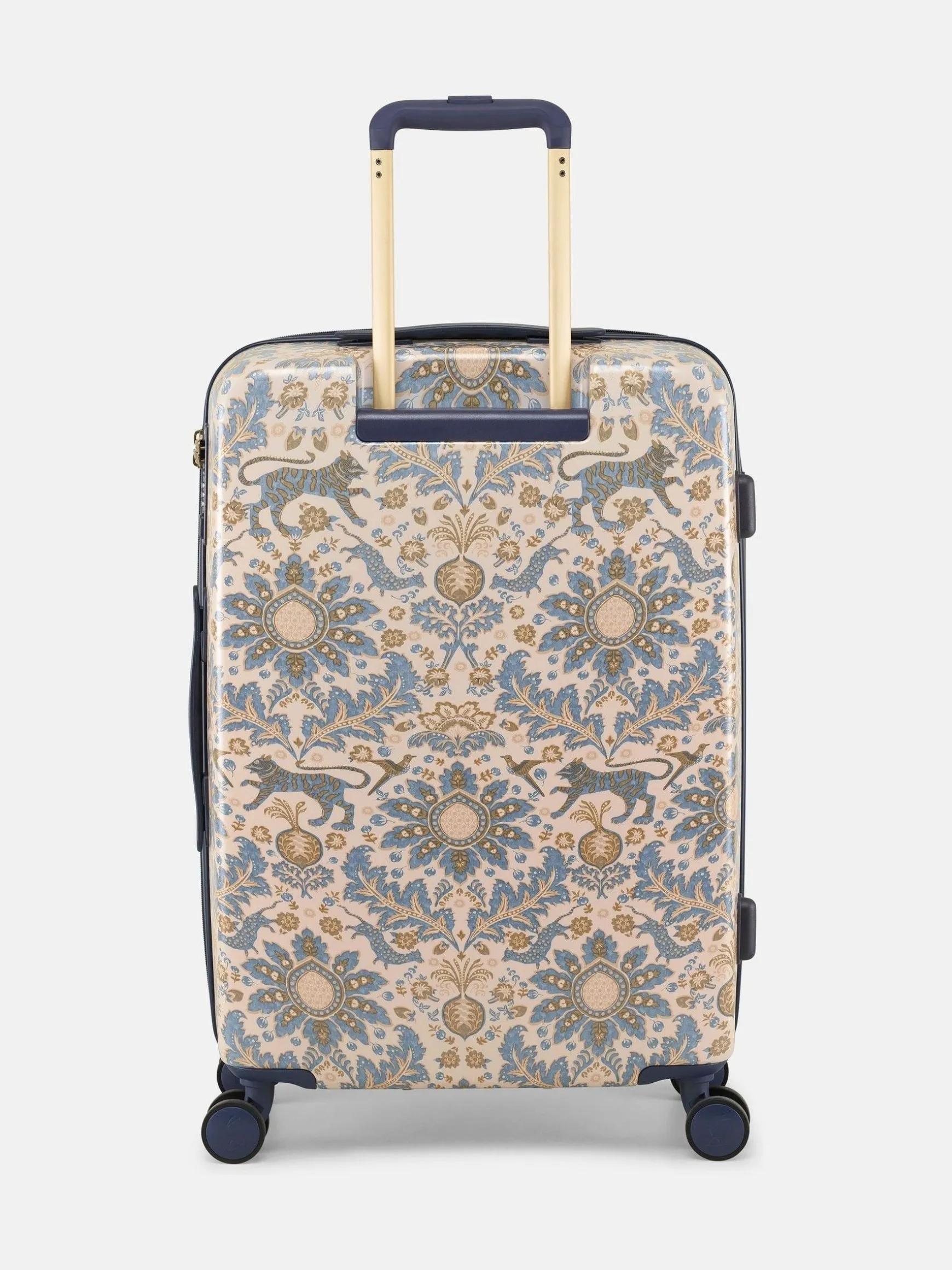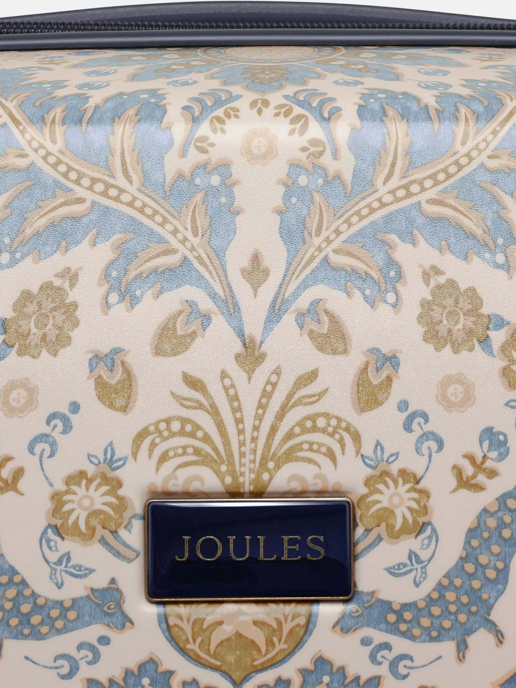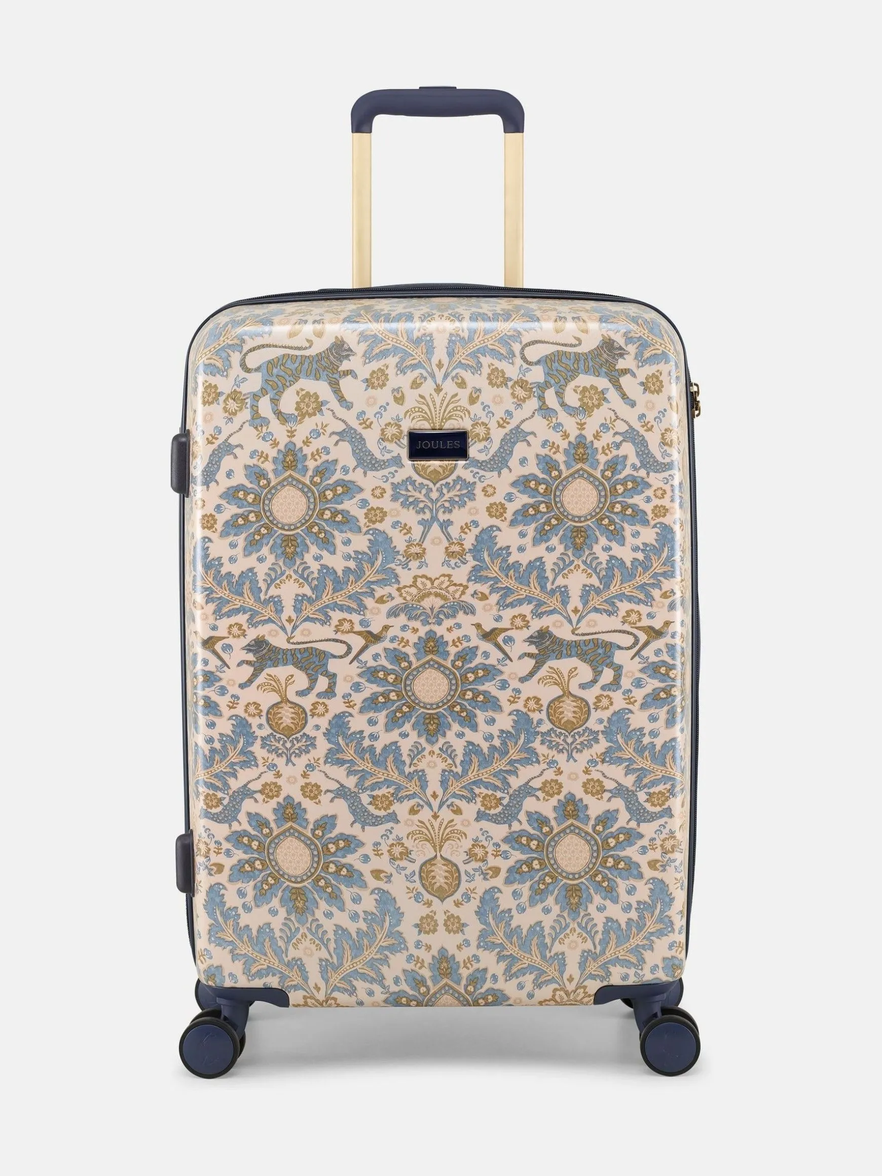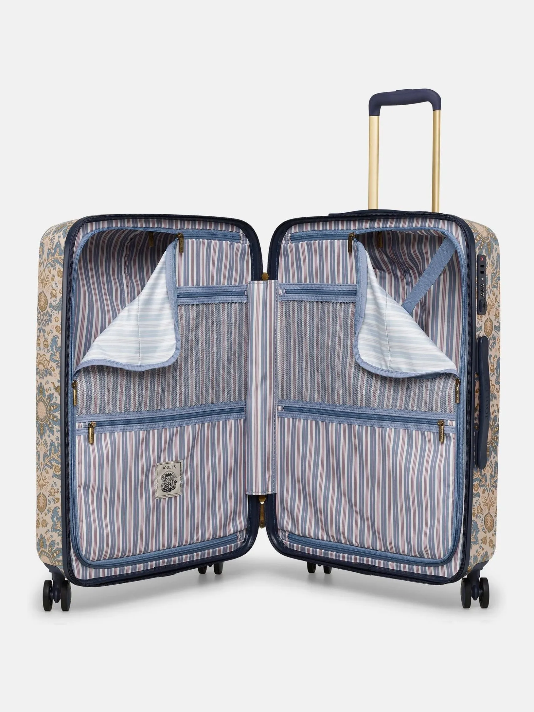 Travel in style with the Joules large-sized suitcase – perfect for long-haul trips to far-flung destinations, or for combining the whole family’s holiday outfits into one case. Its hard shell outer is lightweight, durable and adorned with an elegant damask print which has been hand-drawn by the Joules print team for a truly distinctive look. Its four spinner-wheel design ensures 360° movement and the telescopic trolley handle further enhances its ease of use. To give you full peace of mind when travelling overseas, the TSA-approved lock will ensure all your belongings remain safe. Inside is a haven if your style of packing is of the organised kind. It features two main zipped compartments, one of which has a compression strap for keeping things in place, as well as four additional zipped pockets for smaller items. It’s finished with a striped lining for another unique-to-Joules touch. Part of a four-part luggage collection, you can pick up the matching vanity case, cabin and medium suitcase too. 75.5 x 49.5 x 28cm. Hard shell outer. Lightweight. Fixed carry handle. Telescopic trolley handle with branded push button. Four spinner wheel design for maneuverability. Striped lining. Integrated TSA Lock for secure travel. Two main zipped compartments, with additional zipped pockets for organised packing. Compression straps to one side for compact packing