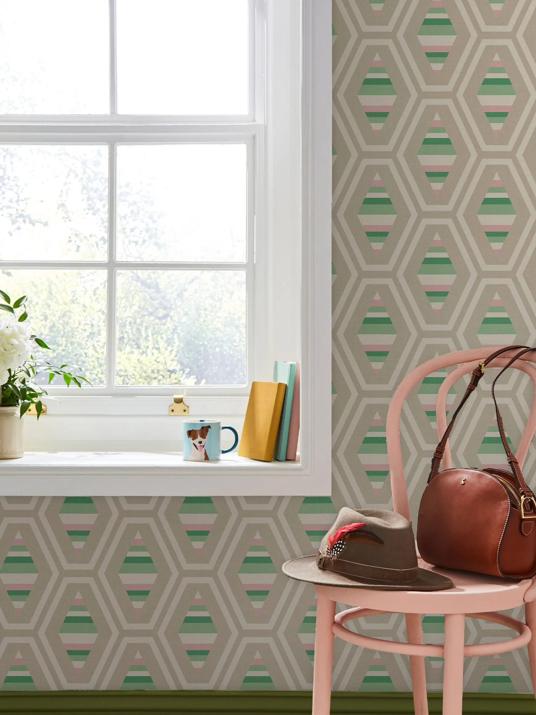 Bring a taste of eclecticism to your home with this textural design. A combination of geometric shapes come together in this design to create a modern style. The contemporary feel is enhanced by the colour combination of garden greens and pops of pink, perfectly sat with shades of warm neutrals and creams. Printed on a matt substrate for a contemporary look and feel. This wallpaper is also paste the wall, making it easy to hang. Pattern Repeat: 52cm, Drop Type: Straight.