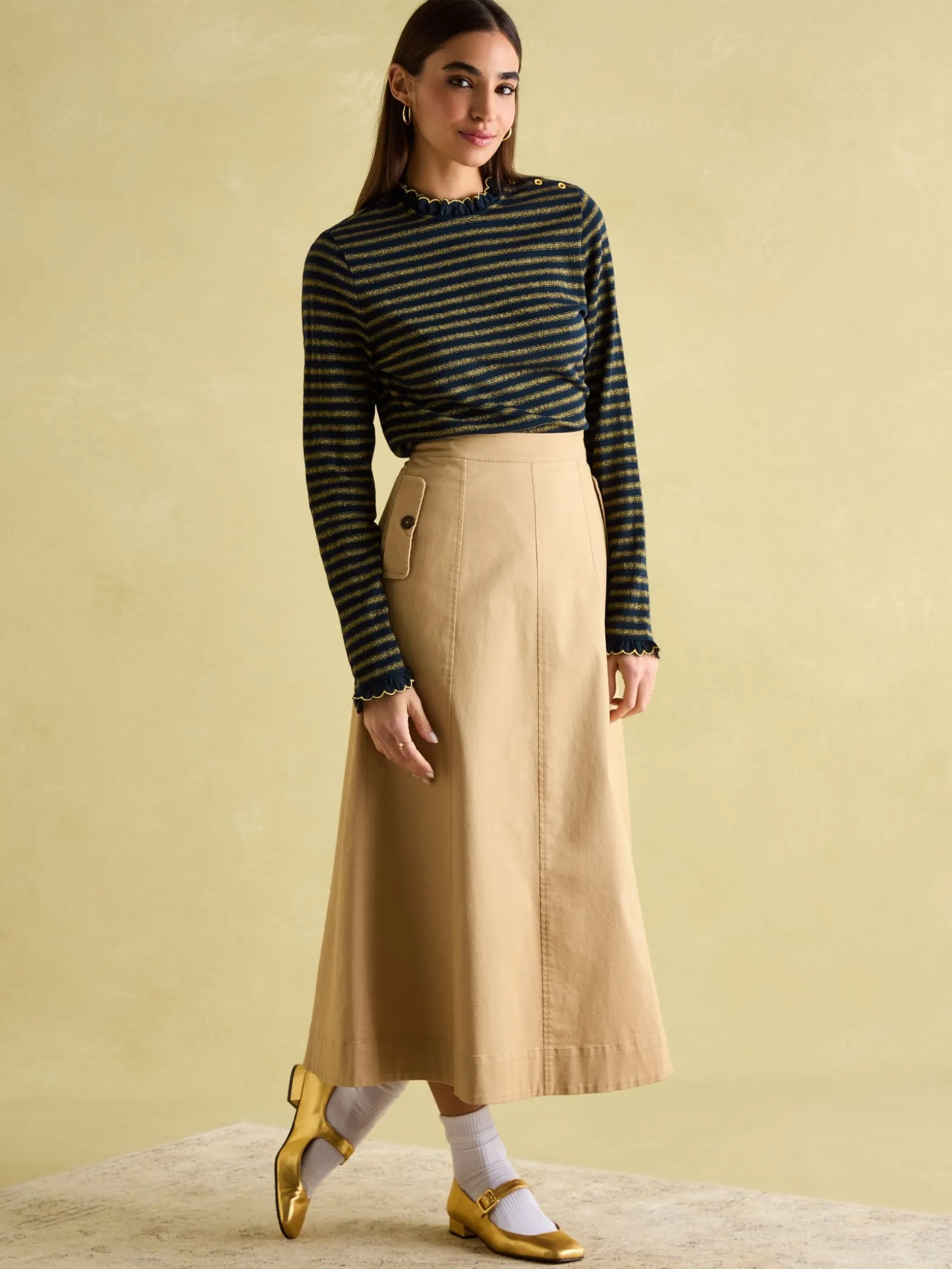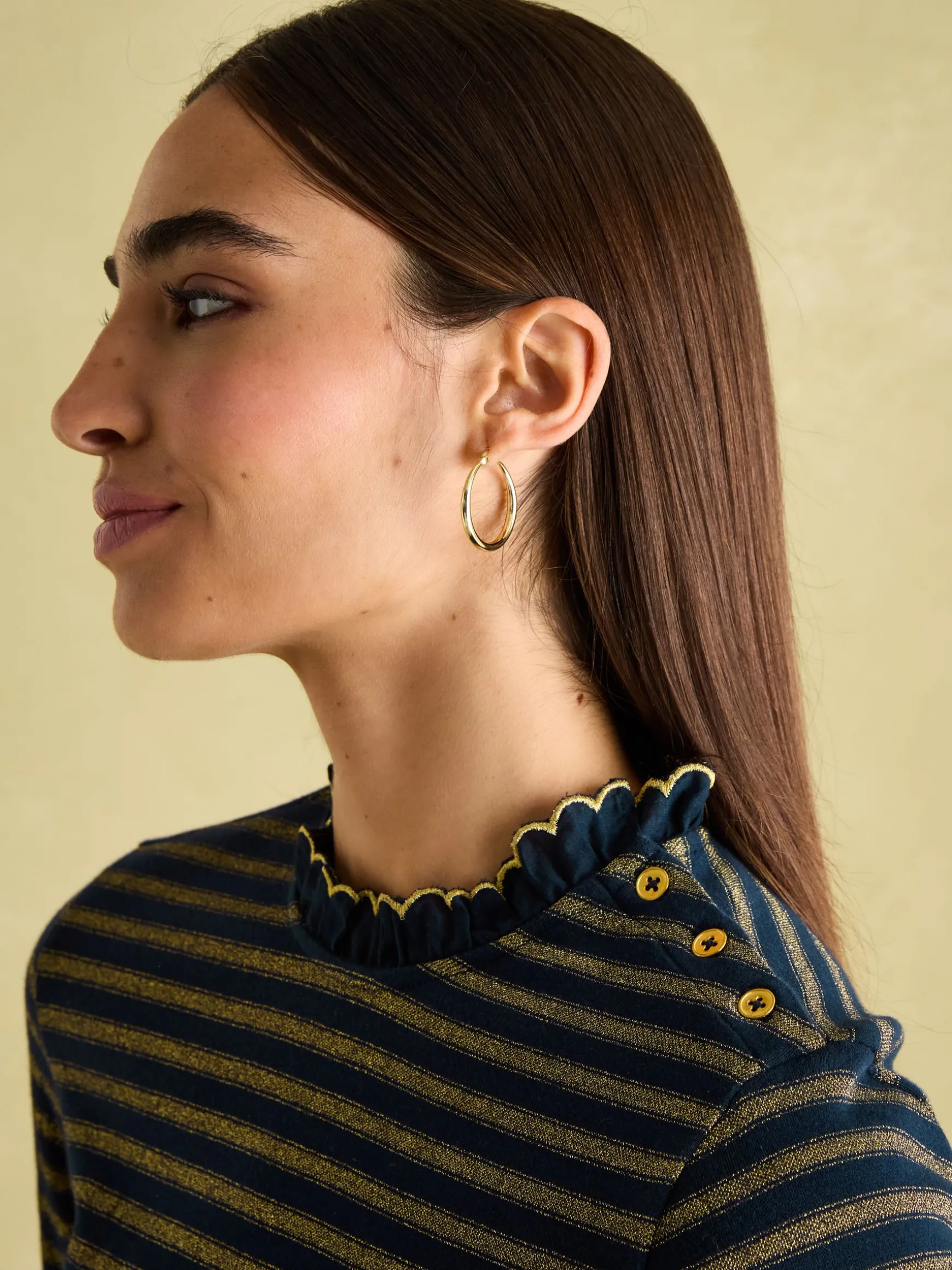 Build on your autumn layers with the Grace jersey top. With a slim fit, it acts as the perfect ‘first’ layer under knits and sweatshirts. It’s crafted from supremely soft jersey, has long sleeves and a frilled neck and cuffs. Buttons to the shoulders and an all-over stripe ensures it remains a stand-out style when worn alone with jeans in fairer weather too. 100% cotton jersey. Slim fit. Long sleeves with frilled cuffs. Buttons to the shoulders. Frilled neck.