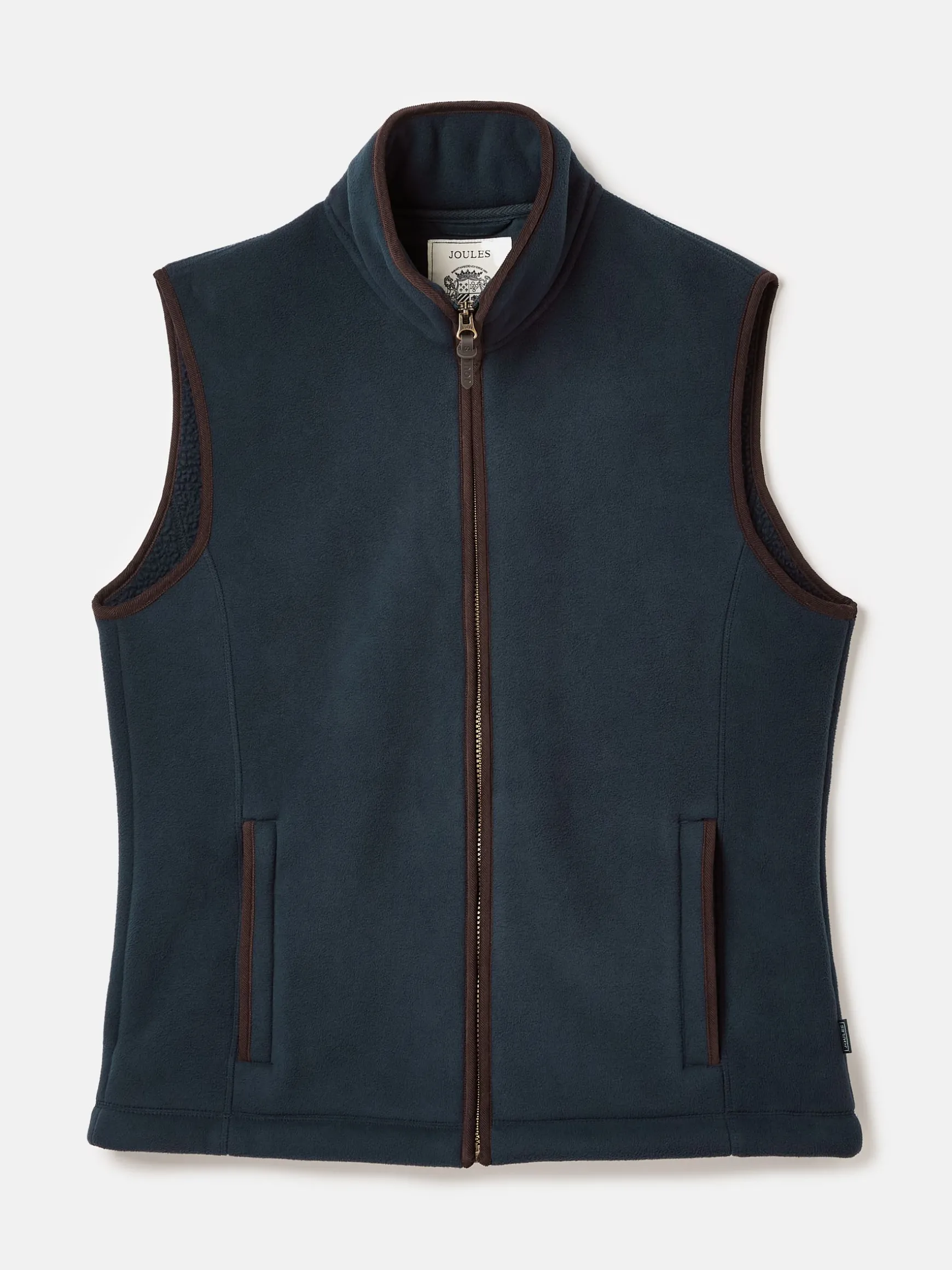 Worn over a shirt or a jumper (or both) this fleece gilet will cut a practical dash, whilst freeing your arms for clambering over stiles, foraging for autumn fruits or plundering the farm shop with ease. The funnel neck will ensure your neck stays warm, the zip fastening (with leather puller) is handy, as are the micro-fleece lined zip pocket and adjustable hem adds another level of function. nnFunnel necknZip fasteningnZip pocketsnAdjustable waistnCord trims and bindings