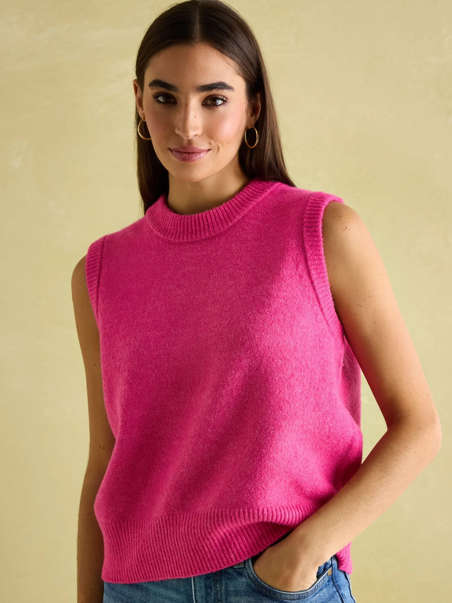 A knit you can wear now and later, the Holly vest is a versatile style to own. In milder weather style alone with chino or denim shorts and when temperatures drop, layer over a ruffle neck blouse of slim-fit top. It comes in an array of colours to choose from and is finished with a ribbed neck, hem and armholes. Knitted. Sleeveless. Longline. Ribbed neck. Ribbed hem. Ribbed armholes.
