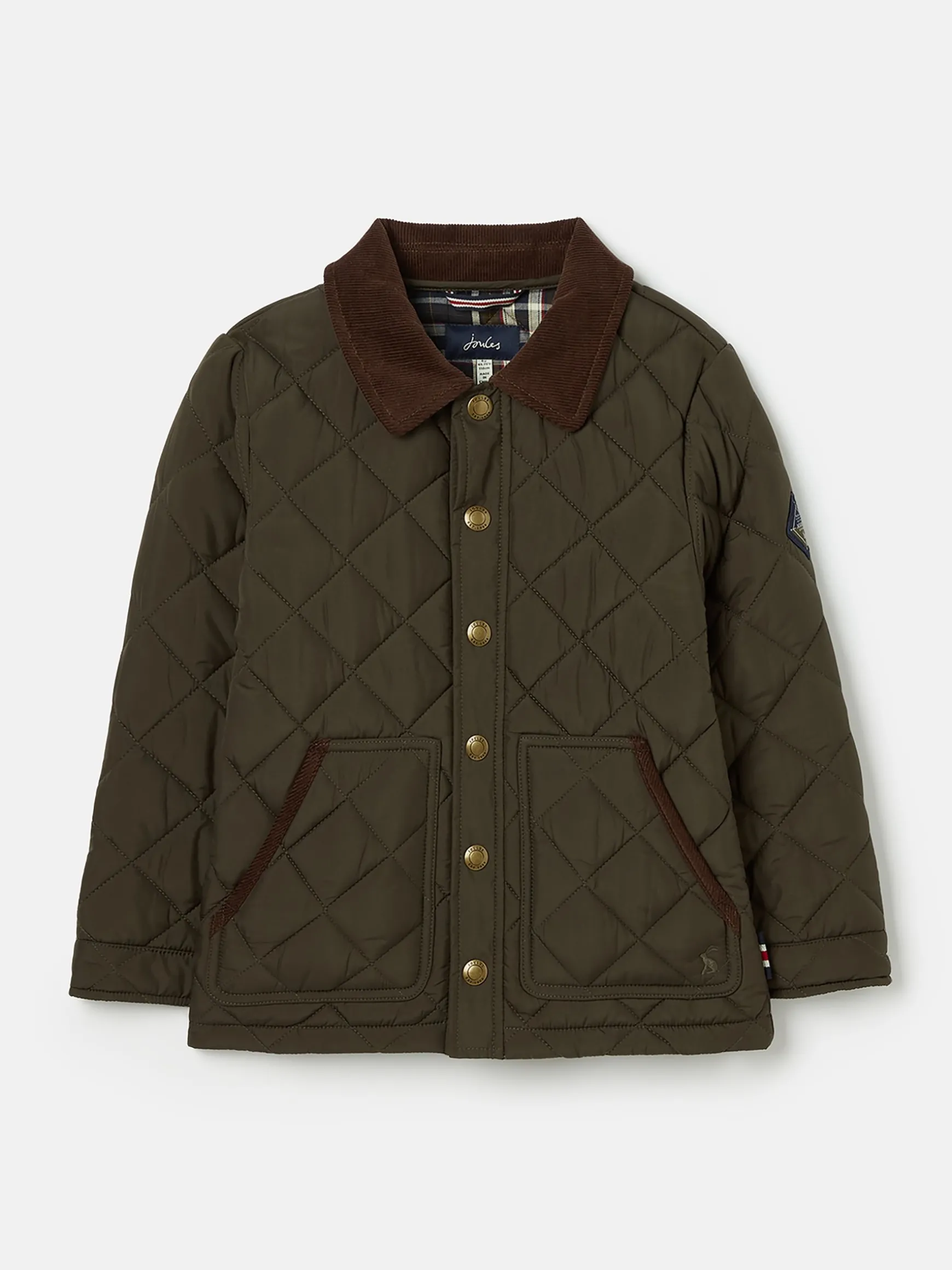 This countryside-inspired jacket is one for dapper little lads that love the outdoors. It has diamond quilting for a lovely layer of warmth, a contrasting quilted lining and two patch pockets to the front for stashing trinkets, treasures and cold hands. For an oh-so-grown-up look, we’ve finished it with antique-style brass poppers and corduroy details to the collar and pocket openings. Looking for the matching gilet style for this jacket? Just search for Hugo. Diamond quilting. Contrast quilted lining filled with wadding. Antique-style brass popper fastenings. Two front patch pockets. Corduroy trims to collar and pocket openings. Joules hare embroidery. Hanger loop to inside neck. Branded badge to sleeve. Striped tape to left cuff. Matching gilet available.