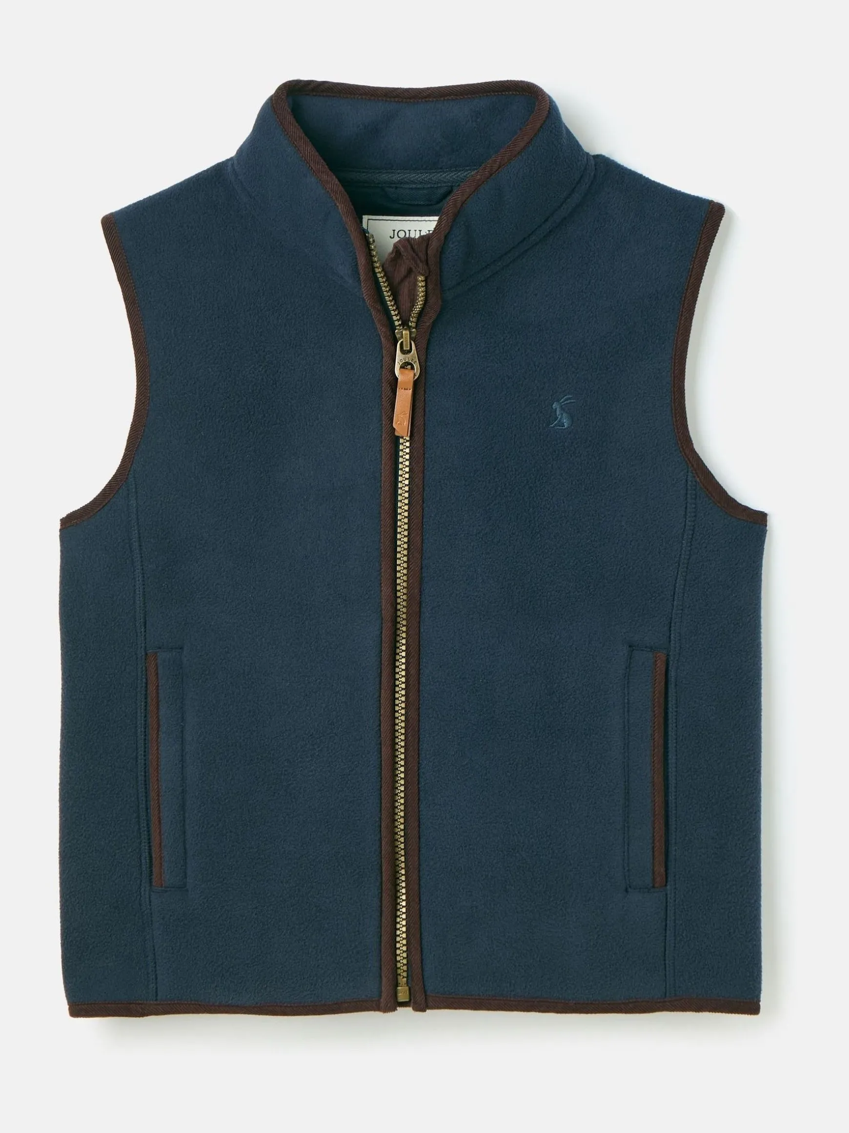 This fleece gilet is an unfussy and good-looking layer that will keep any little chap chill free. Great to wear over a jumper or shirt, or even under a jacket for extra warmth on those super-cold days. Offering easy movement and comfort along with functional features such as fleece-lined pockets, a zip fastening and a funnel neck. Embroidery to the back neck and chest will let everyone know, this fleece is special.nnFunnel necknZip fasteningnTwo front fleece-lined pocketsnCord trimsnHanging loop