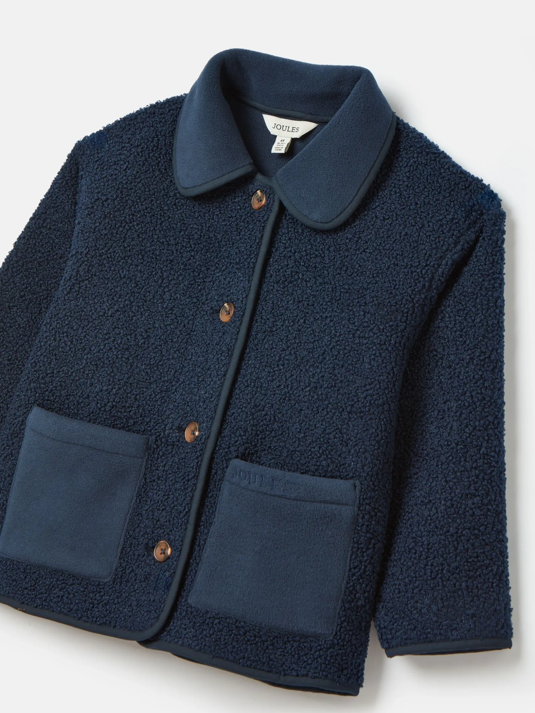 This is the mini version of our women’s Sadie fleece jacket perfect for while your little one still likes to match you. It’s cut to a waist length and comes in a neutral colour that is easy to wear with anything in their wardrobe. The soft, borg fleece outer gives it a plush look, while the polar fleece lining ensures it feels as warm as it looks. The lining fabric is used on the outer too, through the pockets, collar and trims for a touch of contrast. Adding yet more premium appeal is the five faux horn button fastenings to the front. This is a piece they’ll want to wear everywhere. Borg fleece outer. Polar fleece lining. Polar fleece detailing to the pockets, collar and trims. Faux horn button-down fastening. Tonal Joules embroidery to the pocket