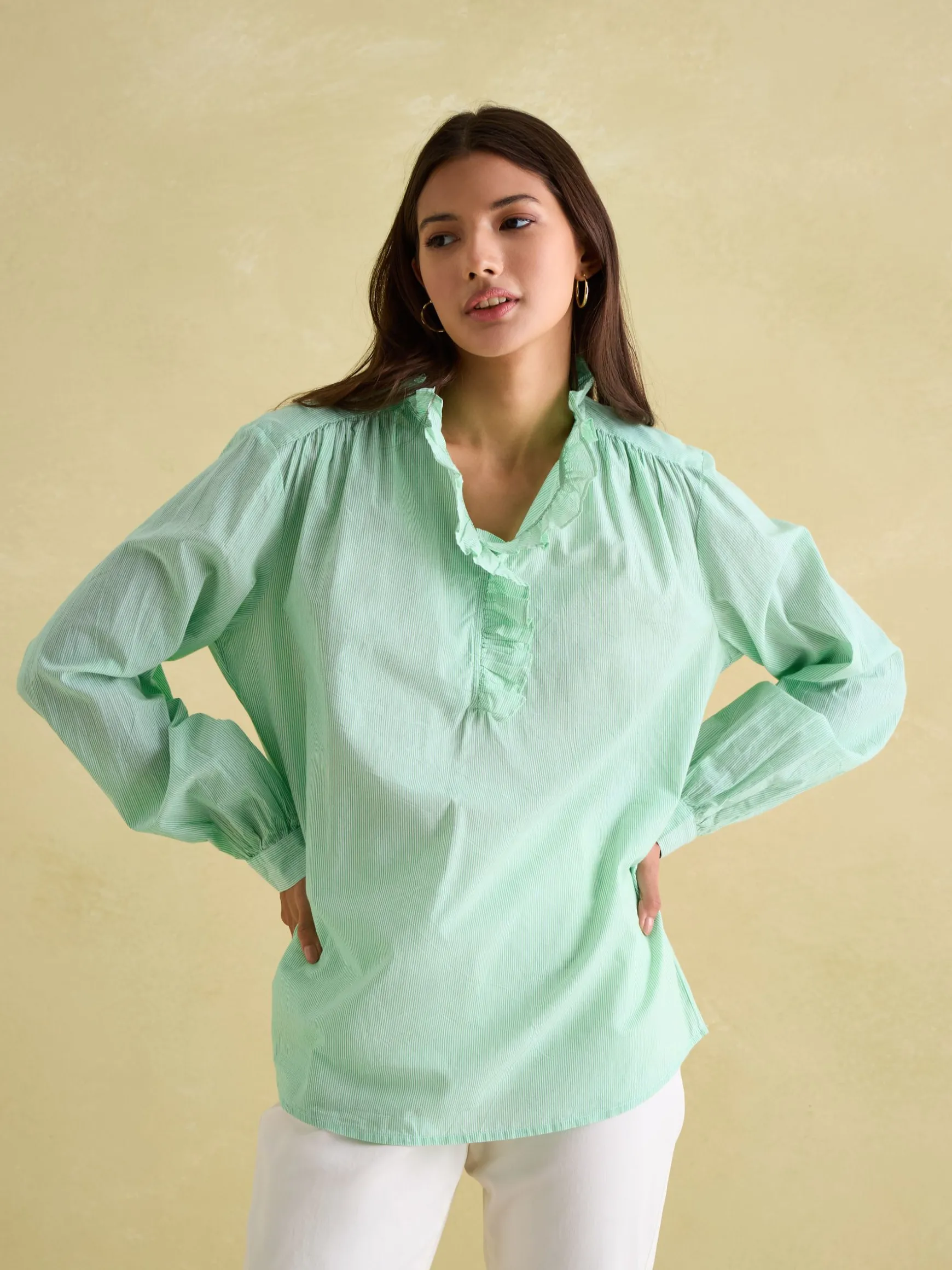 Be the first to review “Melanie Green/White Cotton Ruffle Blouse” Cancel reply