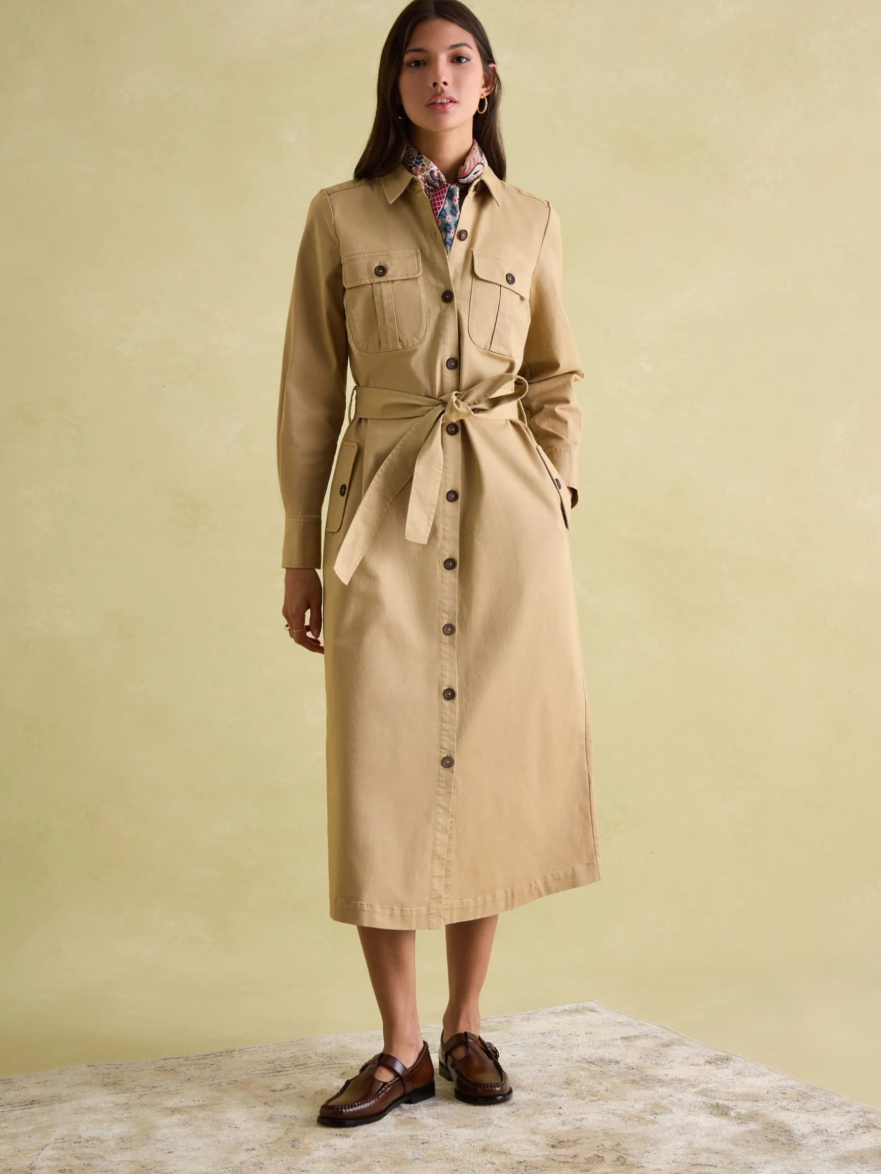 Combining utilitarian style with flattering details, the Meredith dress is a great piece to welcome into your autumn wardrobe. The full button down fastening, abundance of pockets (two at the chest and two on each side) is a nod to its utilitarian influence, while the removable belt allows you to cinch it at the waist, or wear it without for a more relaxed fit. It sits at a midi length and has long sleeves with button cuffs making it a wonder for the cooler months. Wear it with a style of leather riding-style boots for a look that screams British elegance, or pumps for a cool casual feel. Cotton. Midi length. Utilitarian style pockets to the chest and side. Full button down fastening. Collar. Long sleeves with button cuffs. Removable belt at the waist.