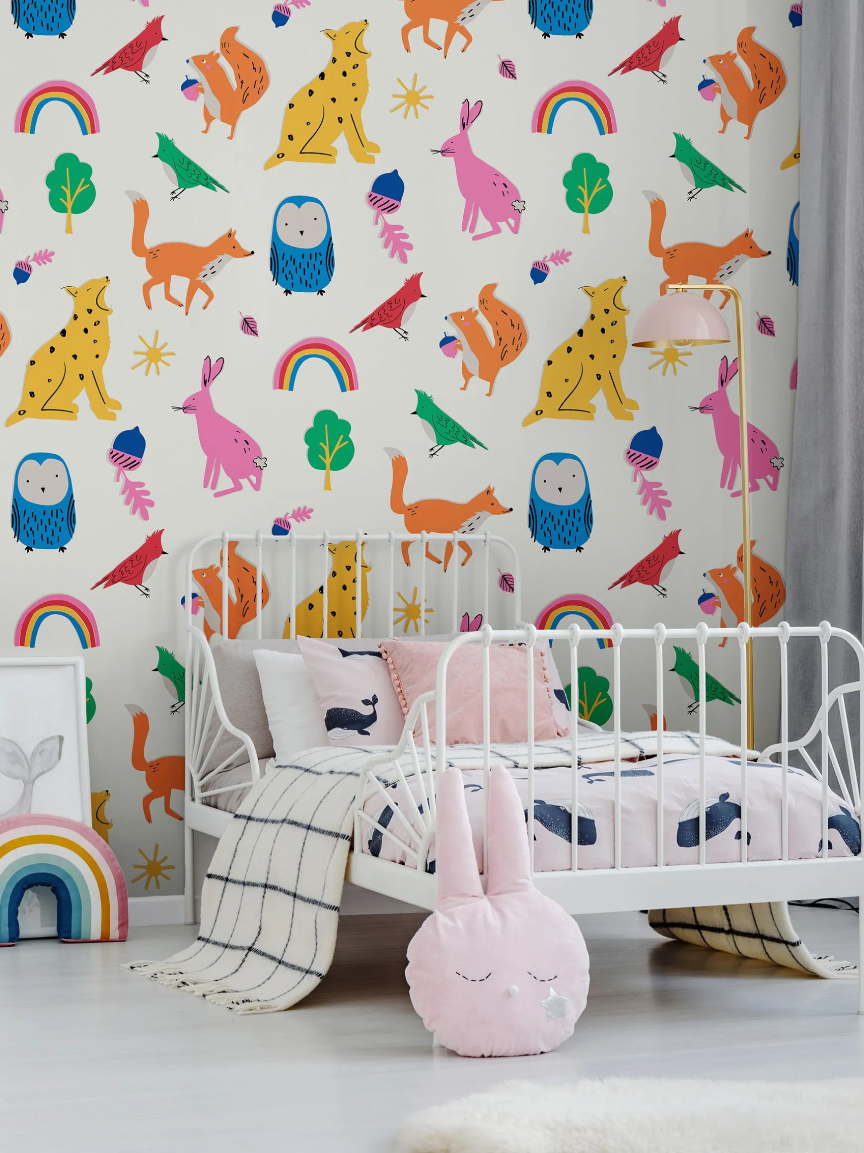 Let your little ones go wild with this medley of country critters, from owls and foxes to birds and squirrels this charming animal wallpaper design will add character to any child’s room. Bold and bright this characterful design has a white background which perfectly showcases the rainbow colour palette. This lovely design has a large repeat for impactful scale and is printed on a matt substrate for a contemporary look and feel. This wallpaper is also paste-the-wall, making it easy to hang.