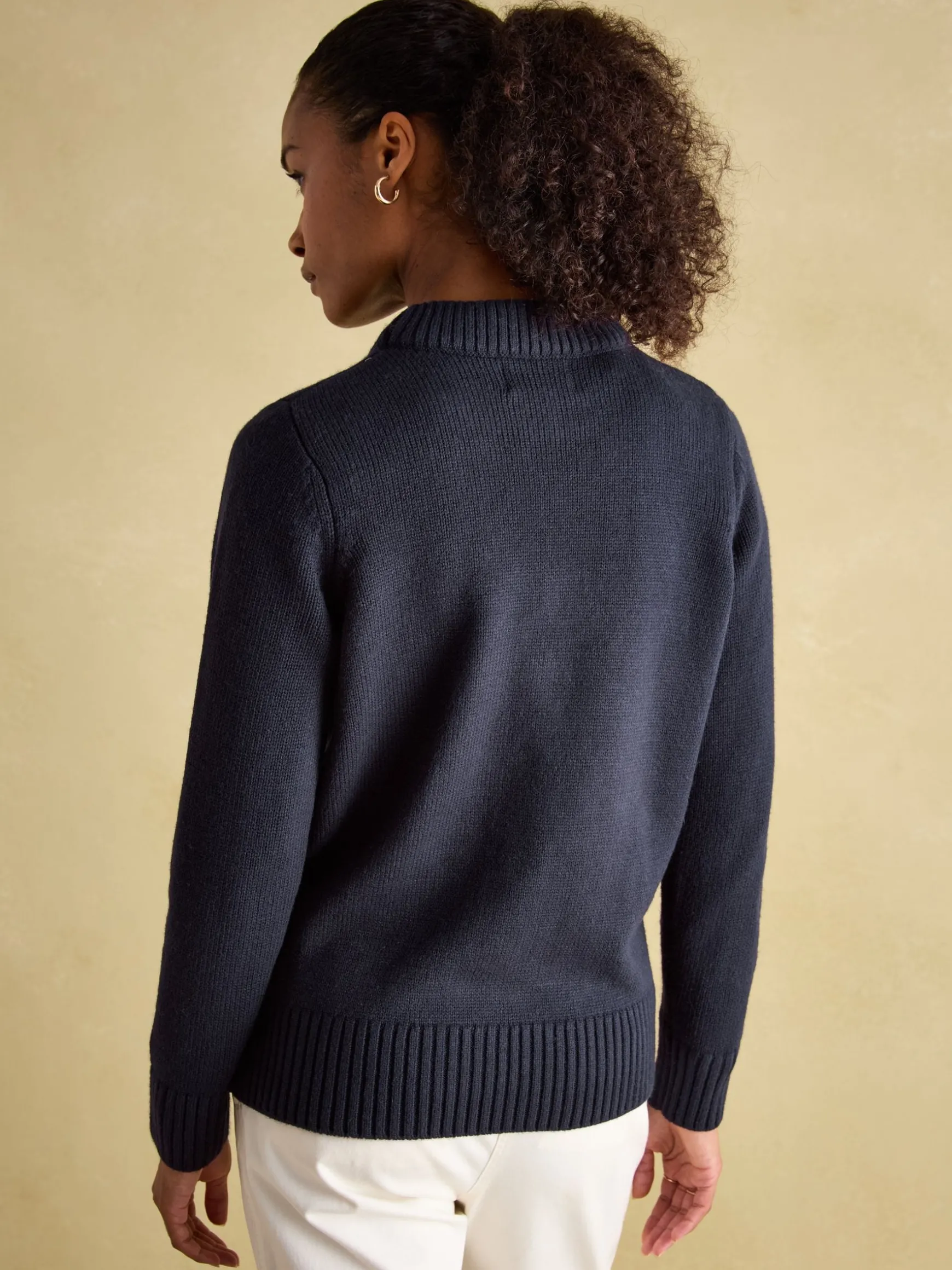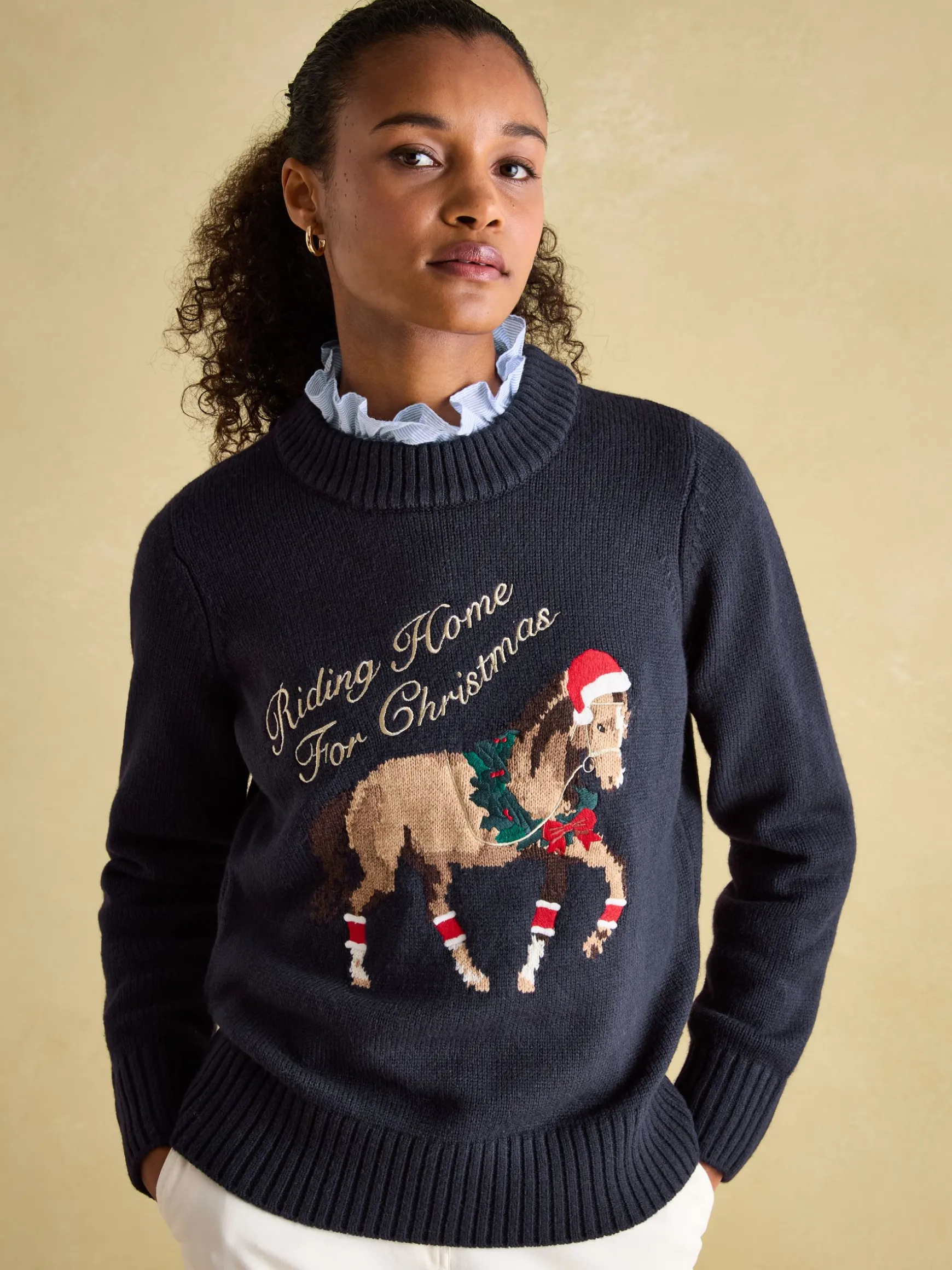 A Christmas jumper with an equestrian twist, the Noelle knitted jumper is perfect for the festivities ahead. It features an intarsia horse bedecked in Christmas accessories to the front, along with the playful slogan ‘Riding Home for Christmas’ in gold metallic thread. The ribbed round neck makes it a great layering piece to wear over shirts or blouses. Finished with a ribbed hem and cuff. Style it throughout December (or earlier if you fancy) to get into the festive spirit. Wool blend. Festive horse intarsia to the front. ‘Riding Home for Christmas’ slogan. Metallic detailing. Ribbed round neck. Ribbed hem and cuffs.