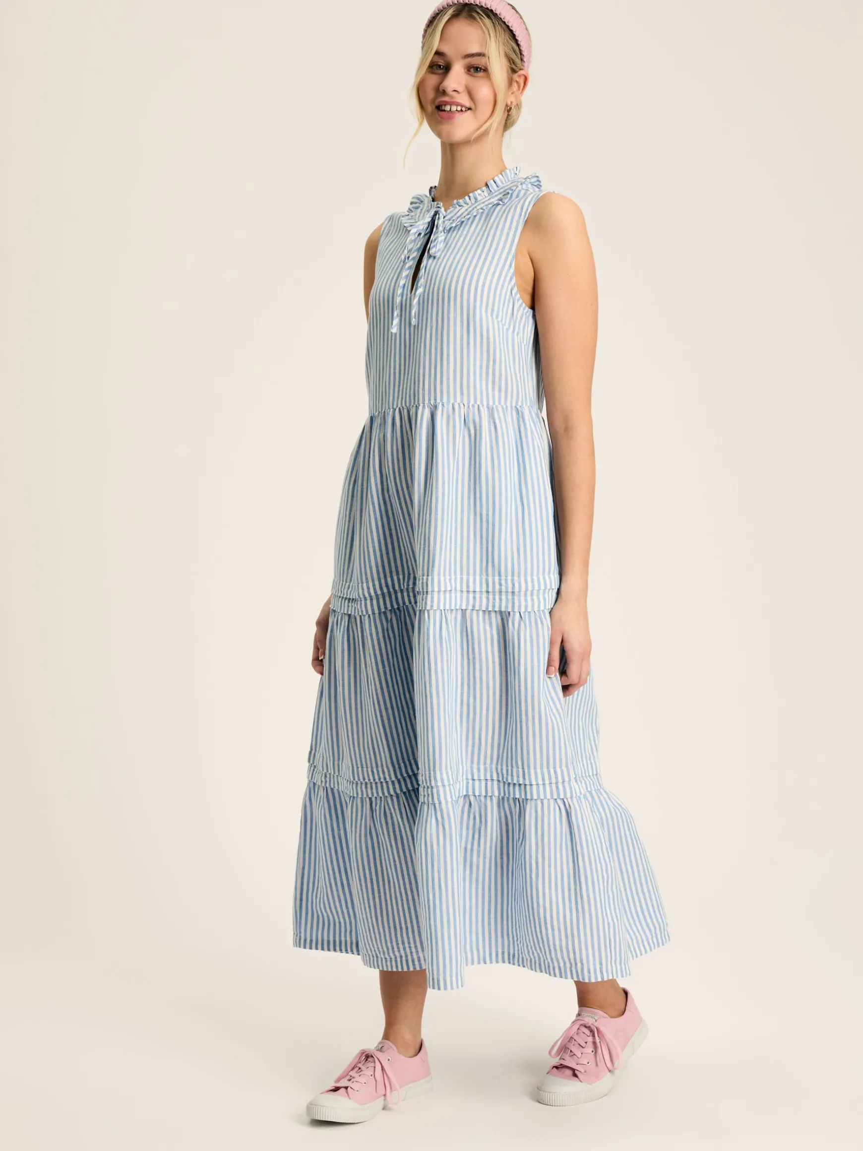 Breeze through the summer in style with the Ophelia dress. The crisp, airey cotton fabric and sleeveless design is perfect for the warmer weather, while the midi length makes it easy to pair with loafers, sandals and even flip flops. It has a tiered skirt with gentle gathering, a gathered waistband and a frilled neck with fabric ties. Pockets in the side seams are a practical addition you’re sure to love. Cotton and linen blend. Midi length. Sleeveless. Tiered skirt with gathers. Gathered waistband. Pockets in the side seams. Ruffle frill neck with fabric ties.