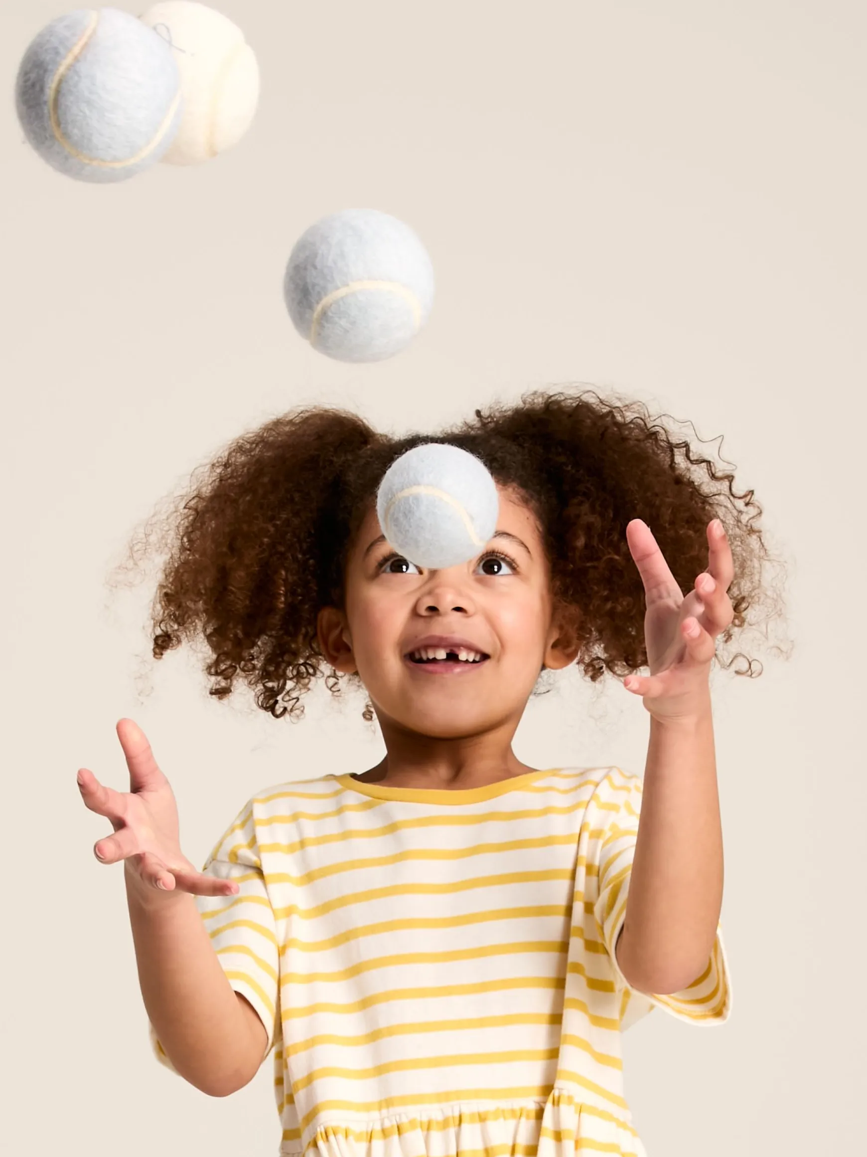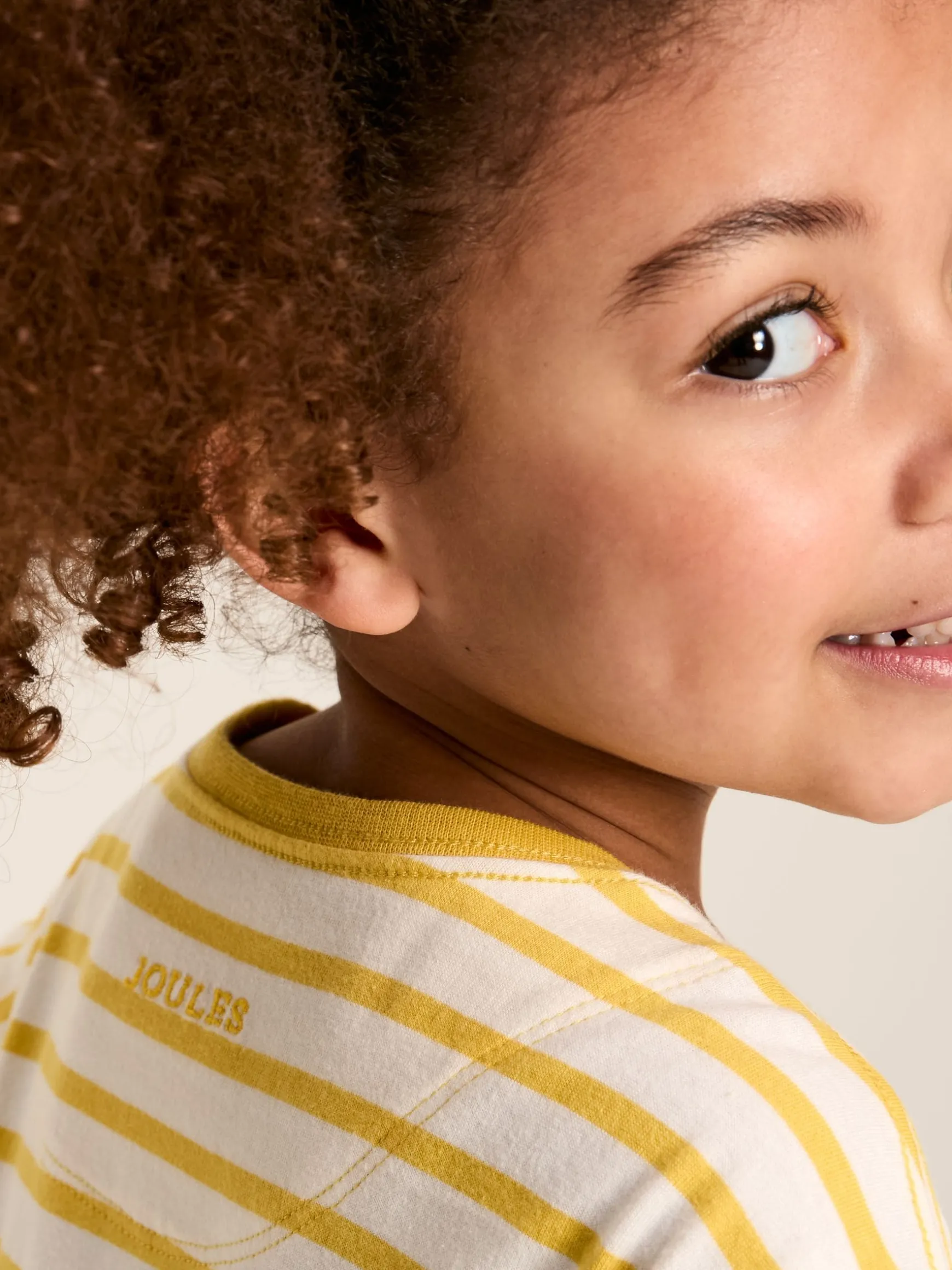 When it comes to summer styles for your little one, easy-to-wear dresses are essential for throwing on and heading out. Skye is crafted from a soft cotton jersey which is easy to maintain and comfortable to wear. It carries the look of a T-Shirt with a round neck and short sleeves before flaring out into a skirt with a gathered waistband. The stripes which adorn it are a simple yet summery touch. Cotton jersey. Short sleeves. Round neck. Gathered waistline. Striped.