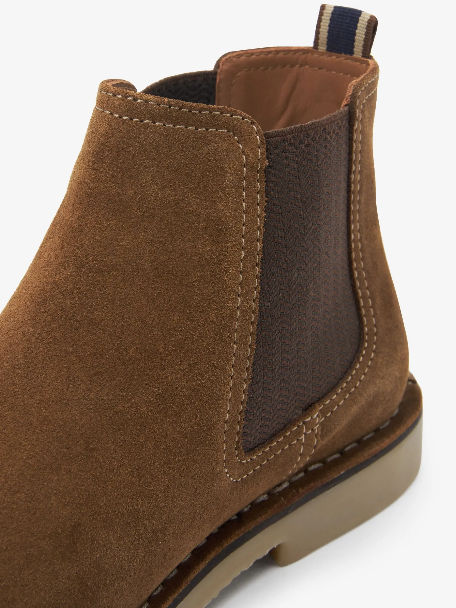 When you’re looking for a versatile boot that can be dressed up or down with ease, our Chelsea boots have a timeless design in a tan brown hue. Whether you’re heading to the office, off to an away day or out for drinks, these boots do it all.nnBoasting a premium suede upper, the boots have elasticated side panels and a pull tab to the heel for easy wear. An Ortholite foam insole makes the footbed perfect for your feet to sink into, providing all-day cushioning. The durable outsole provides grip and longevity, finished with a contrast stitched hem.