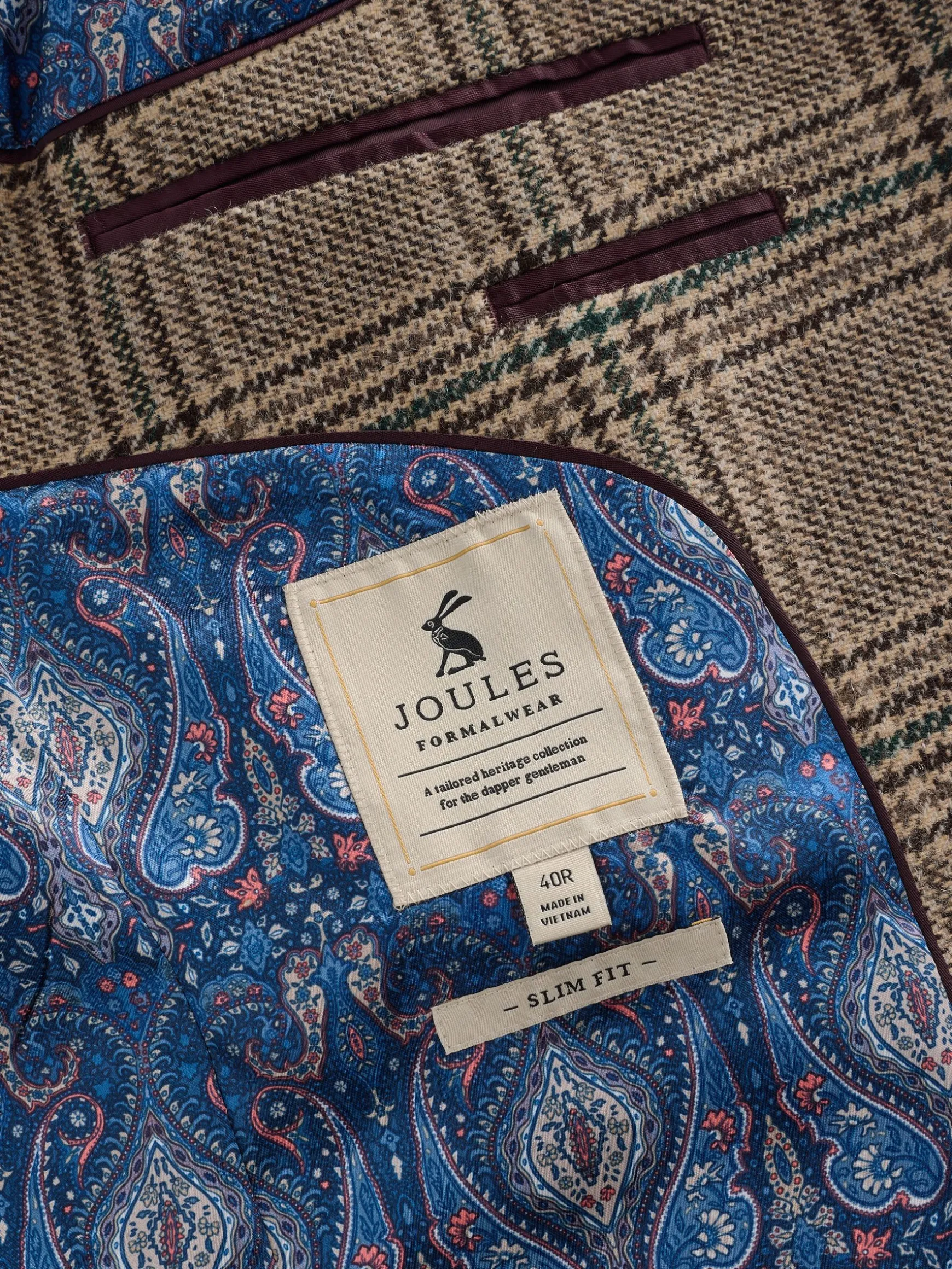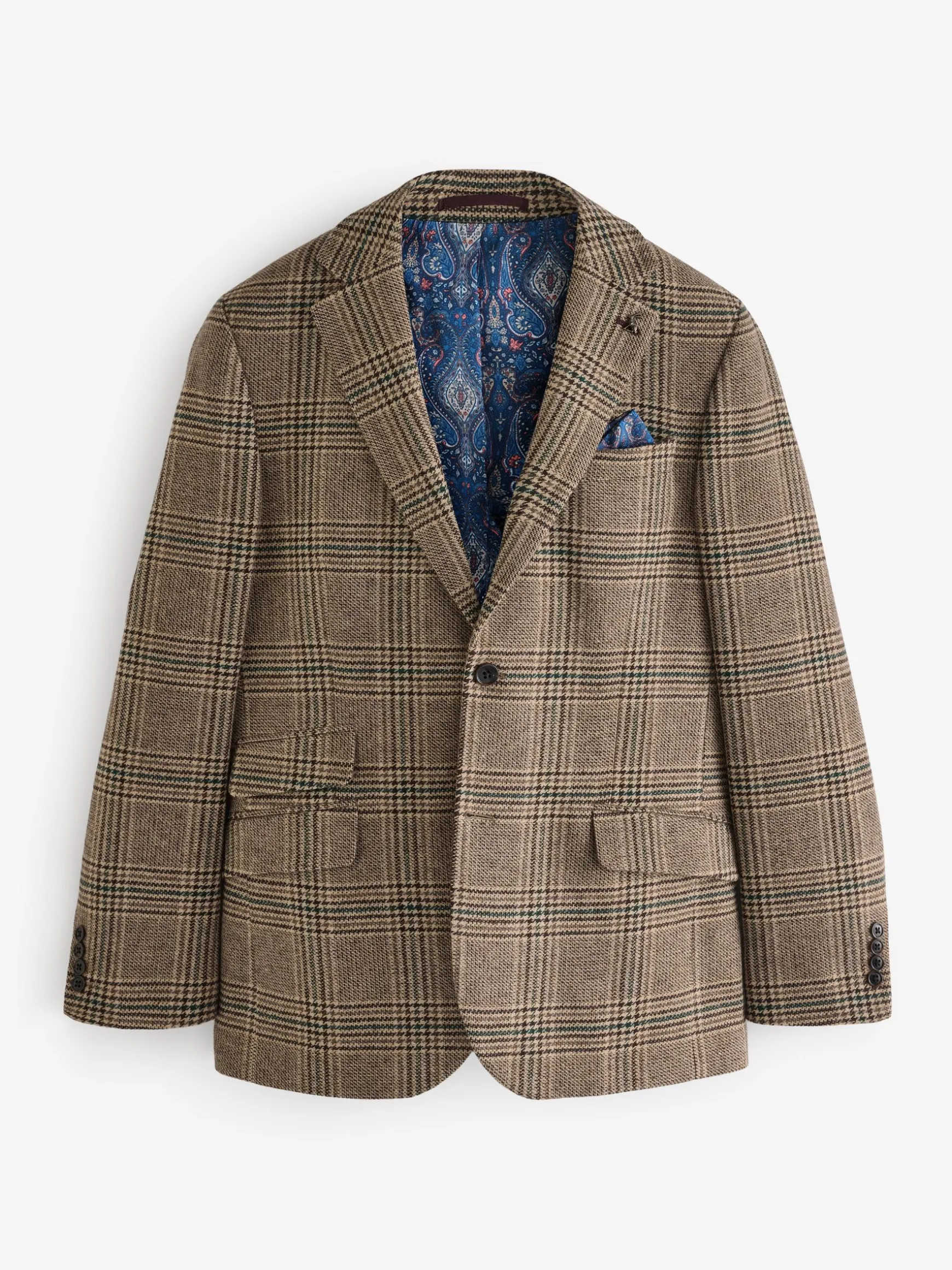 This blazer should hold a space in every gent’s wardrobe. Timeless and versatile, it’s a piece that can be dressed up or down and will tick both formal and smart/casual events. It’s cut to a comfortable slim fit and crafted from quality Italian fabric with a textured check pattern. All the hallmarks of a classic blazer are notable throughout, from the single breasted design and two button fastening, to the notch lapel collar and mock pocket detailing to the front. A single chest pocket comes with a stitched-in satin paisley pocket square which matches back to the lining. It comes with a removable Joules hare pin which can be attached to the collar and inside benefits from plenty of pockets for keeping your essentials safe. Try layering it over a t-shirt and a pair of jeans or chinos for a neat yet stylish look you can lean on time and time again.nn- Slim fitn- Italian checked fabricn- Single breastedn- Notch lapel collar with detachable Joules hare pinn- Paisley printed satin liningn- Two faux horn buttons to the frontn- Kissing buttons to the cuffsn- Single chest pocket with pull-out pocket square (to match the lining)n- Hidden branded detailing under the collar n- Non-functional pockets to the front