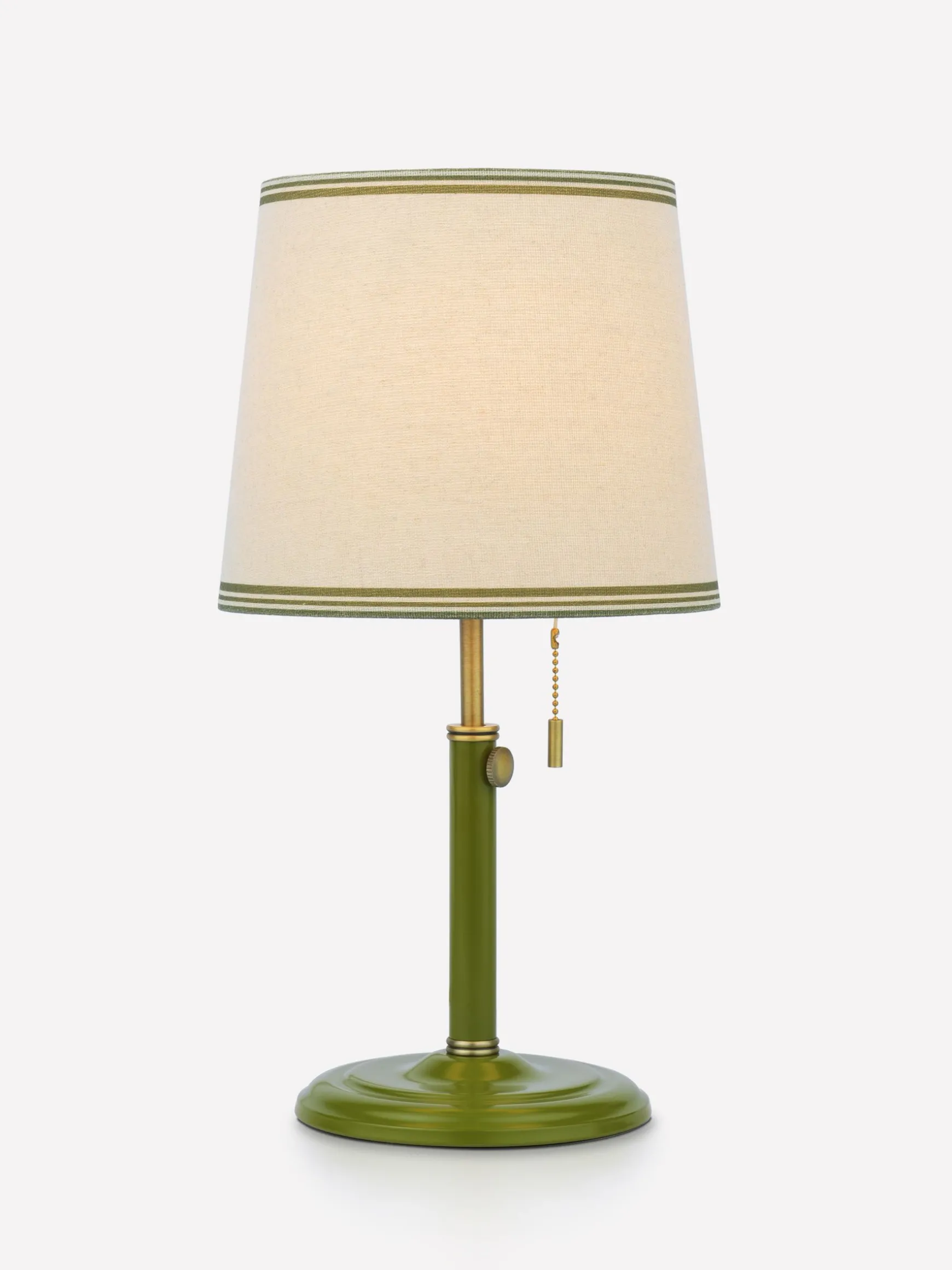 When the urge to refresh your interior strikes, the simple addition of new lighting can give a room a new lease of life. The Upton table lamp has a green matte painted antique brass base for a hint of colour and an adjustable ‘rise and fall’ stand – perfect for spaces of all sizes. It features a linen tapered lamp shade with a coloured border and a pull cord switch which offers a functional detail while also giving a nod to retro style. Create a cohesive space with the matching Upton wall light. nnRise and fall table lampnAdjustable standnPainted matte antique brass basenTapered linen light shade with green bordernPull cord functionnMatching wall light available separately nDi:200mm x H.425 – 355mm