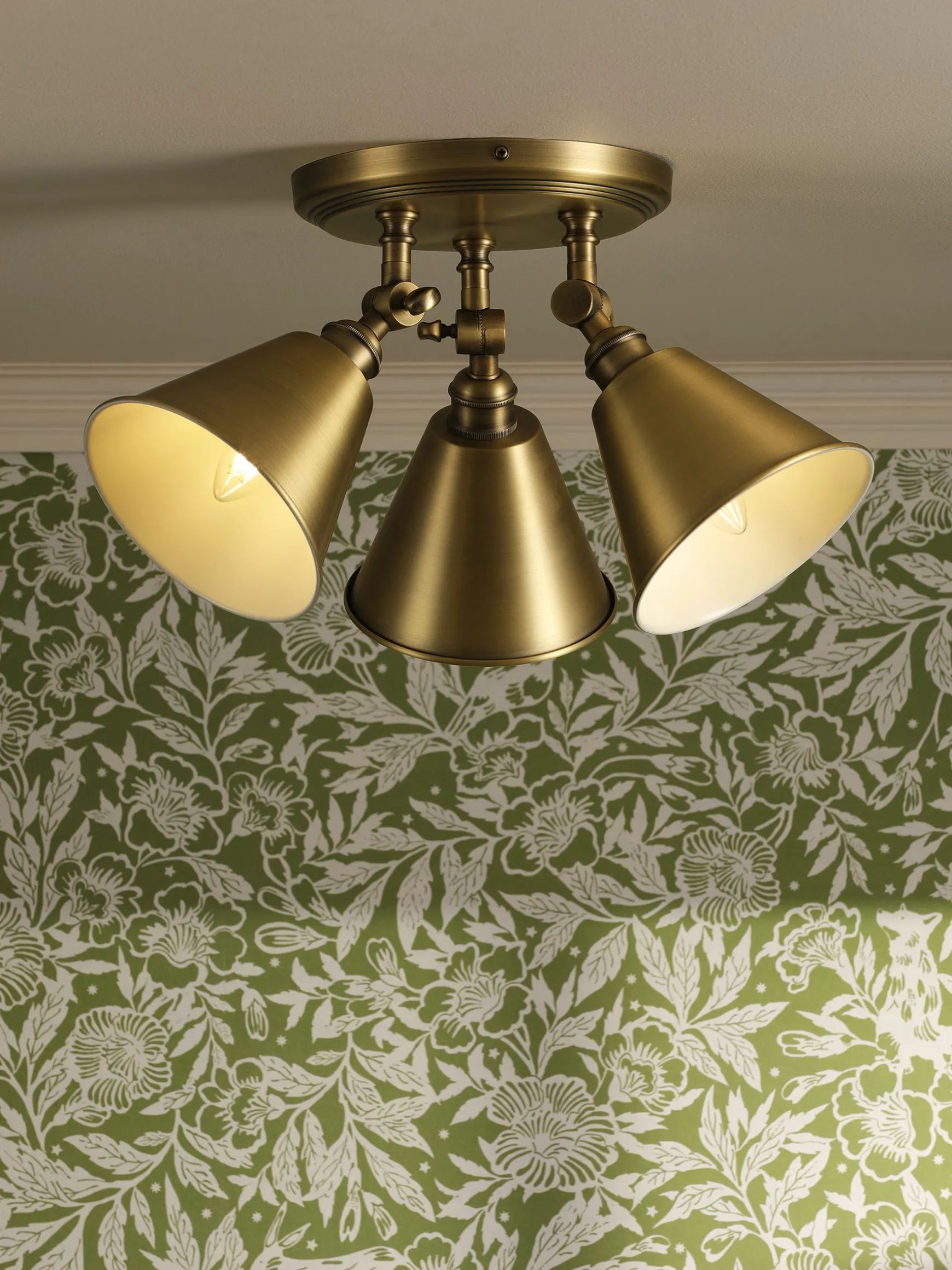 With a sleek, unfussy design and crafted from matte antique brass, the Wollaton three-way ceiling light is perfect for lovers of minimalist decor. Three cone-shaped pendants direct the light downwards and are fixed to moveable arms so you can adjust to your needs. Offering both style and versatility, they can be hung in any room of the house – but bathrooms and kitchens are great room choices.nnThree-way designnCone shape nMatte antique brassnMoveable armsnShade Di: 150mm x H110mm